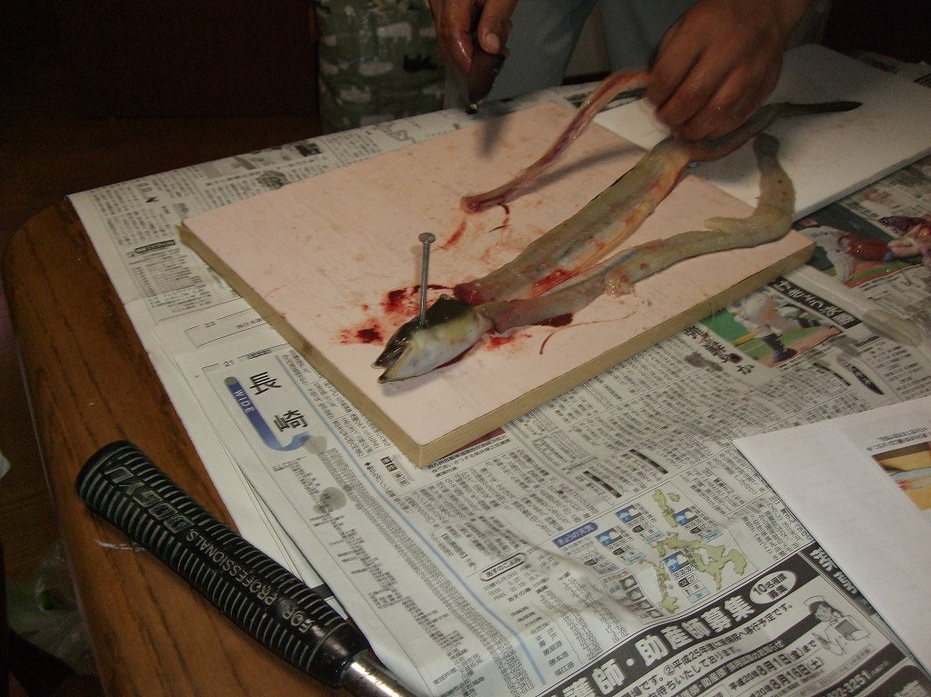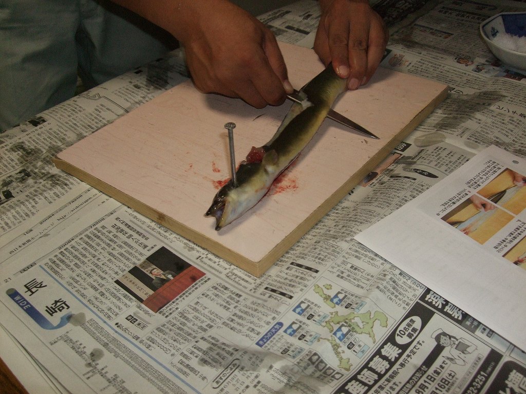 「頭を固定して背中(腹からは関西風らしい)から包丁を入れる」