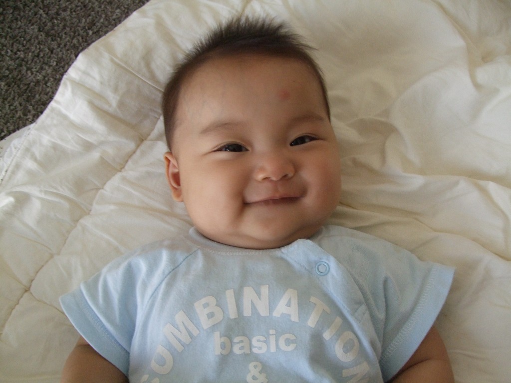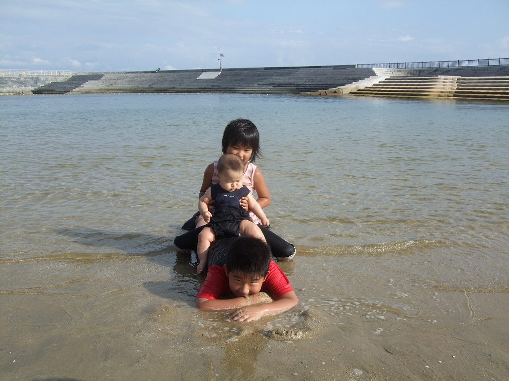子供は海水につかるだけで「汗疹(あせも)」にはならない、すぐ治る。と、本当かどうかわからないが田舎のじいさん、ばあさんが言っていたので5ヶ月のうちのチビも海水浴!