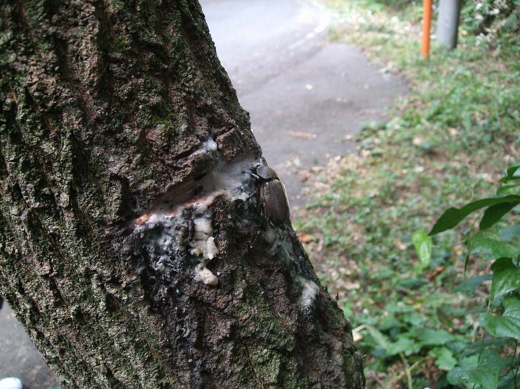 目的地へ着いてクヌギの木をキック!