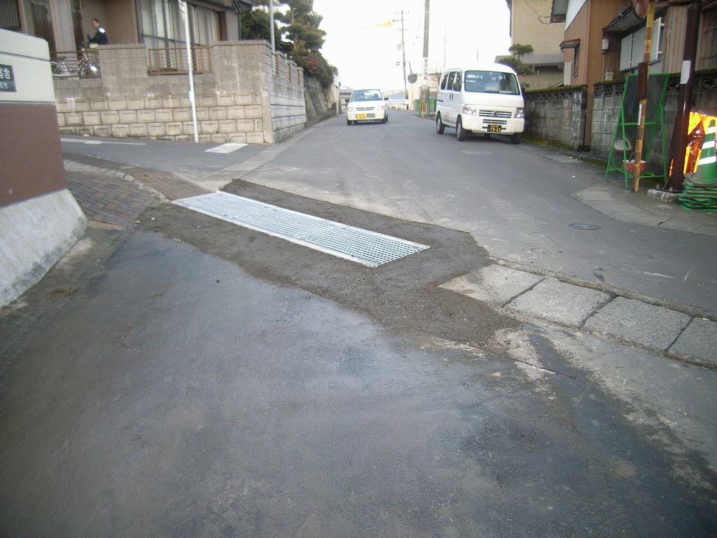 この側溝を片側交互通行規制で新しい側溝にやり直します。
