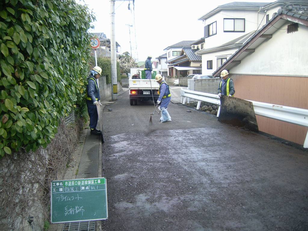 アスファルトと地盤の接着剤の乳剤を散布します。