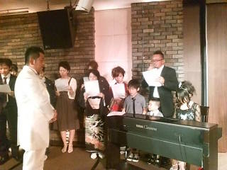 ↑新郎のために娘の生演奏で歌う常務(新郎の兄)